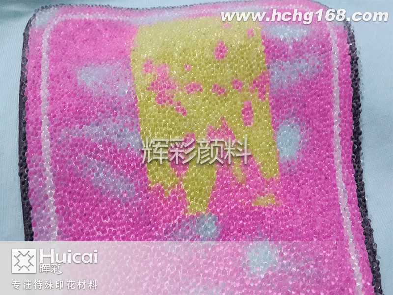第一步: 先印輝彩印花材料的HC-800粘珠漿一次吹干打底,然后再印第二次時(shí)以膠珠的大小來(lái)確定印粘珠漿的厚度,或是印第三次粘珠漿以便留有足夠的粘珠漿